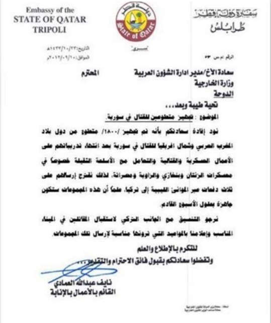Πρόσφατα το ιρανικό ειδησεογραφικό Fars αποκάλυψε ένα διπλωματικό ντοκουμέντο της Πρεσβείας του Κατάρ στη Λιβύη.Αυτό αποκαλύπτει ότι το Κατάρ στρατολογεί μισθοφόρους για να πολεμήσουν στο πλευρό των τζιχαντιστών σε Συρία και Ιράκ.Το ευρείας κυκλοφορίας γαλλικό περιοδικό “Marianne” (27/06/2014) επιχείρησε να ταυτοποιήσει την αυθεντικότητά του. Σύμφωνα με το ιρανικό πρακτορείο αυτό το έγγραφο που ανακαλύφθηκε στην πρεσβεία του Κατάρ στη Τρίπολη της Λιβύης επιβεβαιώνει ότι η κυβέρνηση της Doha στρατολόγησε κι εκπαίδευσε μαχητές από Τυνησία,Μαρόκο,Αλγερία για να πολεμήσουν στη Συρία στις γραμμές του Ισλαμικού Κράτους του Ιράκ και της Συρίας ΙSIS ή του Λεβάντε (EIIL). Το έγγραφο υπογράφει ο επιτετραμένος της πρεσβείας του Κατάρ στην Τρίπολη ο Nayef Abdullah Al-Emadi. Το έγγραφο διευκρινίζει ότι οι μισθοφόροι θα έπρεπε να σταλούν αρχικά στη Τουρκία από λιμάνια της Λιβύης, για να φθάσουν στο Ιράκ δια του ιρακινού Κουρδιστάν. Το έγγραφο προβλέπει την αποστολή συνολικά 1800 ατόμων σε τρεις ομάδες.Οι στρατολογημένοι μισθοφόροι θα εκπαιδεύονταν σε διάφορες στρατιωτικές βάσεις της Λιβύης σε στρατόπεδα σε Benghazi, Zawiya, Misrata και Zintan όπου αυτοί θα εξοικειώνονταν με τη χρήση βαρέων όπλων.