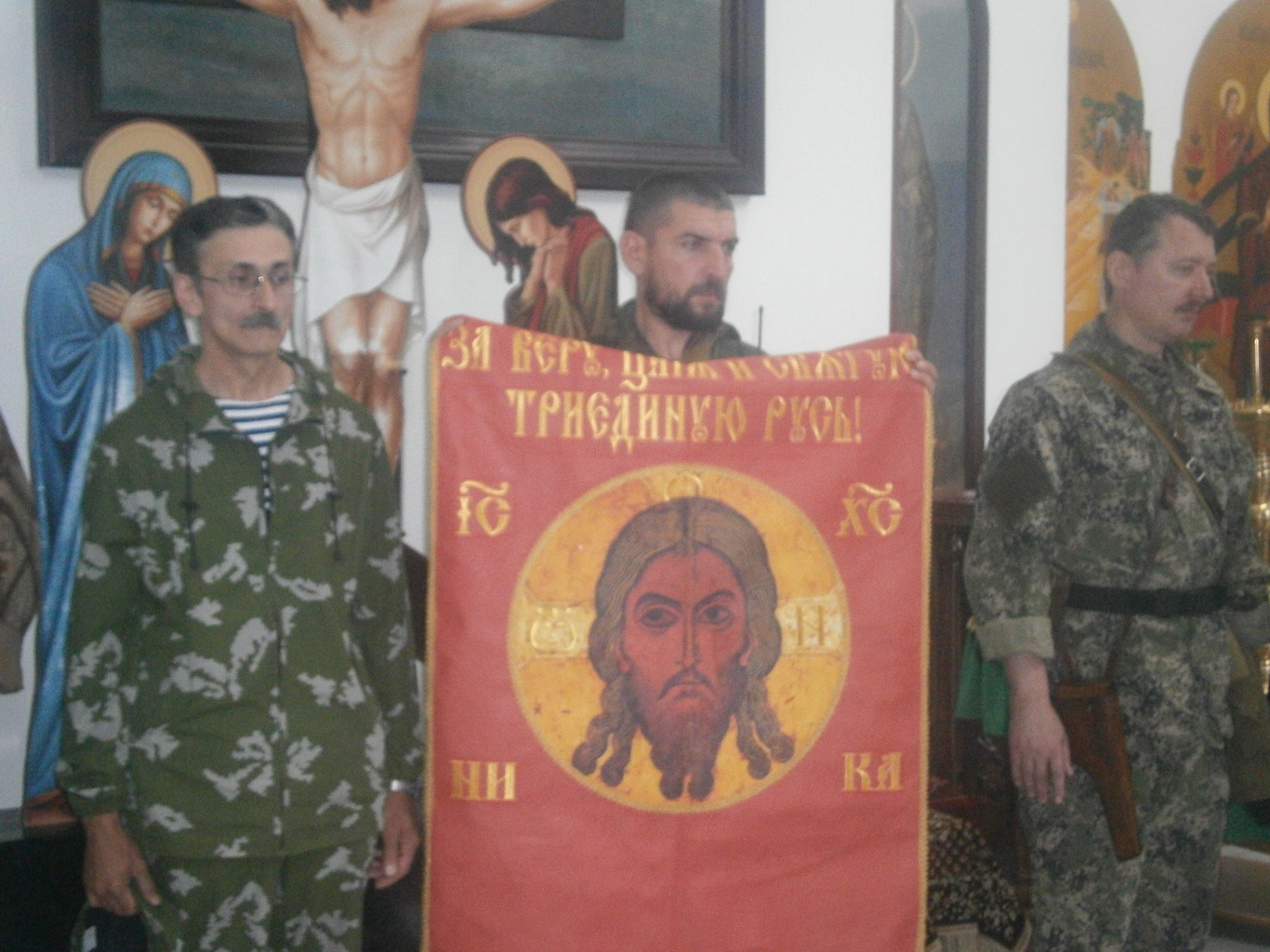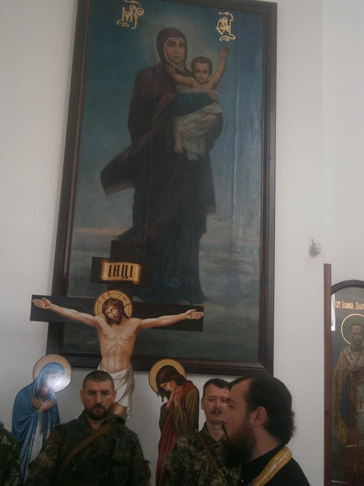 Ο στρατιωτικός ηγέτης των ρωσόφωνων της Ουκρανίας Igor Strevglof σήμερα 29/06/14, με φαντάρους εθελοντές της 1ης Μεραρχίας του Slavyansk, ευλόγησε το λάβαρο της εξέγερσης με την αποτύπωση του Ιησού καθώς και τη σημαία της Νέας Ρωσίας στον ορθόδοξο ναό της Ανάστασης. Οι βομβαρδισμοί συνεχίζονται παρά την υποτιθέμενη πρόσκαιρη ανακωχή που διακήρυξε ο Ποροσένκο. Οι κάτοικοι παραμένουν στις επάλξεις αδιαφορώντας για τη ψυχρή στάση της Ρωσίας.