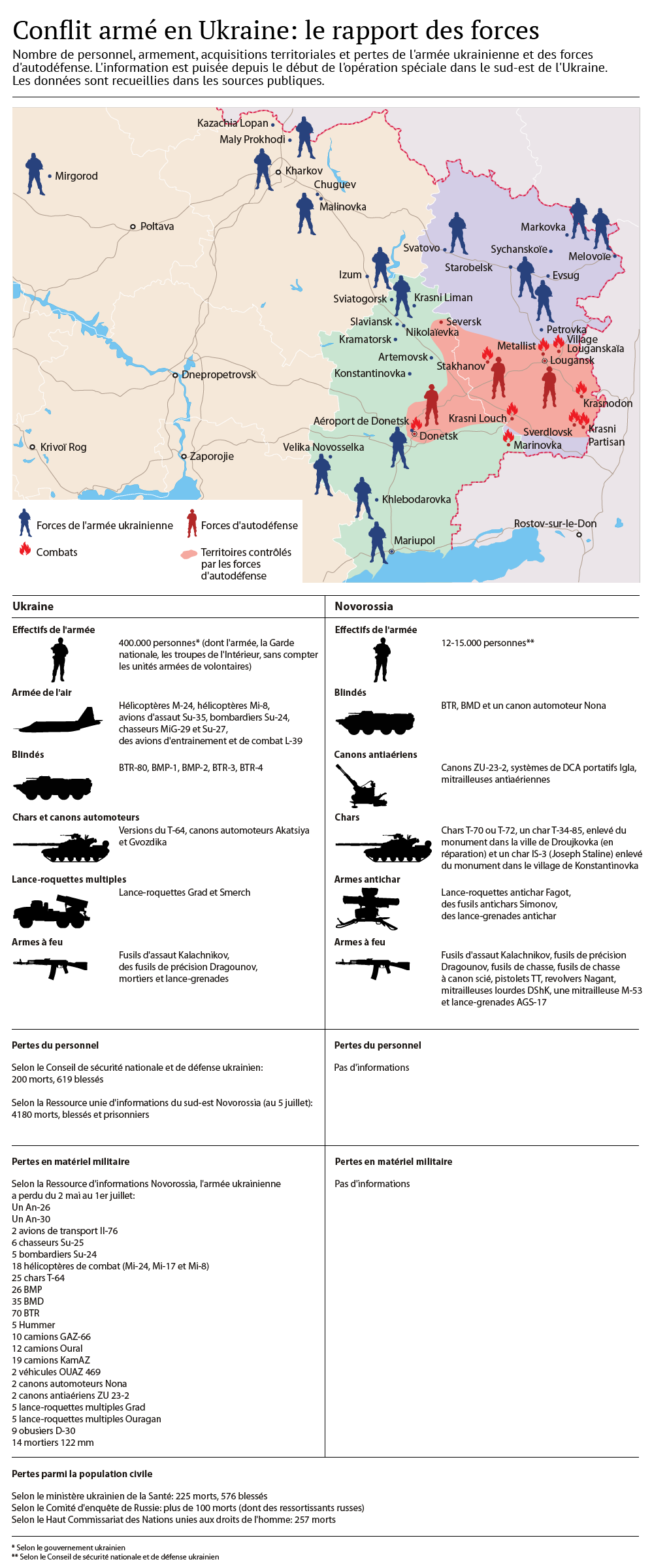 Δημοσιοποιήθηκε γράφημα με τις θέσεις που κατέχουν τα αντίπαλα στρατόπεδα στην Αν Ουκρανία ή Ν Ρωσία αλλά και αναλυτικός πίνακας όπου καταγράφoνται το ανθρώπινο δυναμικό, ο εξοπλισμός, οι απώλειες σε έμψυχο και άψυχο υλικό εκατέρωθεν.Τα δεδομένα προέρχοντραι από δημόσιες πηγές.(RiaNovosti)