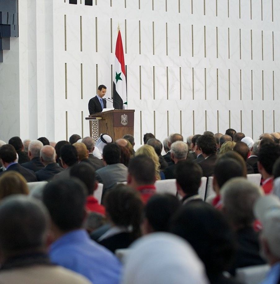 Σε αυτό το ύφος κινήθηκε η ομιλία του Προέδρου Bashar al Assad στο Προεδρικό Μέγαρο μετά την ορκωμοσία του μπροστά στους περίπου χίλιους προσκεκλημένους του, μεταξύ των οποίων βουλευτές, υπουργοί και θρησκευτικοί ηγέτες μουσουλμάνων και χριστιανών, χθες στις 16/07/14.