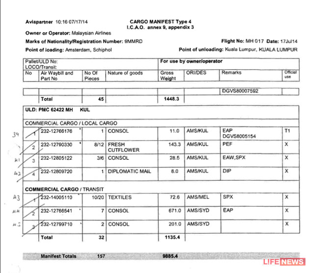 Στις αποσκευές του το μοιραίο αεροσκάφος μετέφερε σε διπλωματικούς σάκους 8 κιλά διπλωματική αλληλογραφία με προορισμό Σίδνεϊ, Μελβούρνη, Κουάλα Λουμπούρ και άλλες πόλεις. Η ίδια διπλωματική αλληλογραφία στάλθηκε από το Άμστερνταμ προς Κουάλα Λουμπούρ.