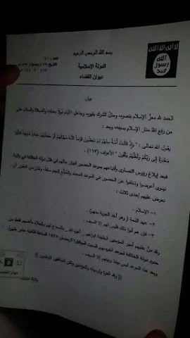 Eκπνέει σήμερα το τελεσίγραφο του Ισλαμικού κράτους κατά των τελευταίων χριστιανών της Μοσούλης. Στις 18.07.14 η figaro αναφέρει ότι οι τζιχαντιστές του Ισλαμικού Κράτους έστειλαν τελεσίγραφο στους χριστιανούς δίνοντάς τους μόνο κάποιες ώρες διορία να εγκαταλείψουν την πόλη.Η τριπλή επιλογή που τους τέθηκε είναι εξισλαμισμός, dhimma ειδ. φόρος ή εκπατρισμός.