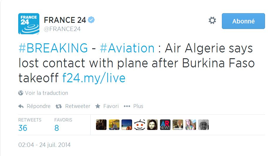 Τώρα τα γαλλικά μέσα μεταδίδουν με την μορφή του κατεπείγοντος. Πανικός στις αλγερινές αερογραμμές Air Algérie !Ένα αεροπλάνο της με τόπο αναχώρησης το Ouagadougou στο Burkina Faso εξαφανίστηκε από τα ραντάρ.Eίναι boeing 737 Η πτήση όφειλε αρχικά να αφιχθεί στην Αλγερία στις 5.40 σήμερα το πρωί.Η εταιρεία έχασε επαφή με το αεροσκάφος 50΄μετά την απογείωσή του από την Burkina Faso.Η πτήση ήταν η AH 5017. Θεωρείται ότι πέρασε από την έρημο υπάρχουν πολλές ανησυχίες για την τύχη του αεροσκάφους του των επιβατών και του πληρώματος.