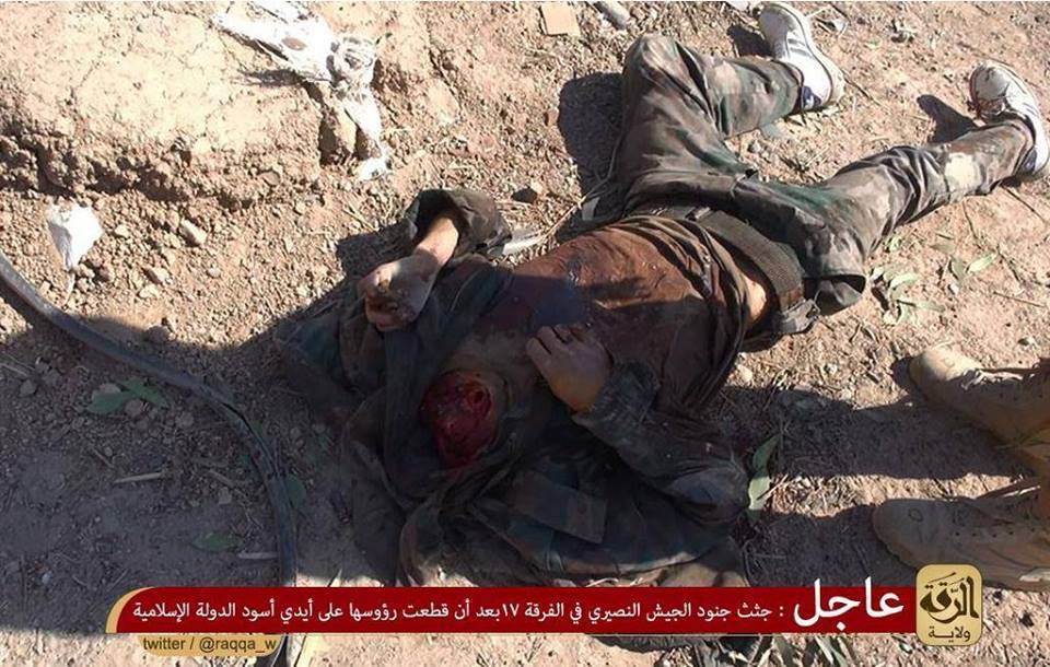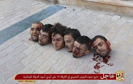 Ένα ακόμη έγκλημα πολέμου αποσιωπείται από τη διεθνή κοινότητα.Tραγικές εικόνες καταγράφονται στη Ράκκα της Συρίας.Ομαδικός αποκεφαλισμός σύριων στρατιωτών αναρτήθηκε σε φιλοζιχαντιστικά twitter.