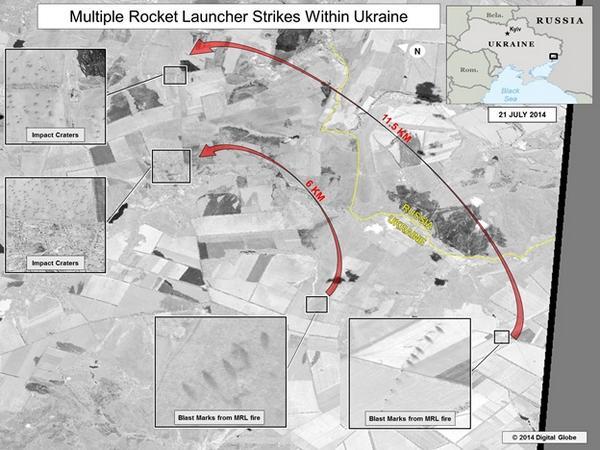 Οι ασπρόμαυρες και χαμηλής ευκρίνειας φωτογραφίες και αναρτήθηκαν στο λογαριασμό tweeter της αμερικανικής αντιπροσωπείας στο ΝΑΤΟ, αποτελούν για τις ΗΠΑ το αποδεικτικό υλικό της ρώσικης επέμβασης σε ουκρανικό έδαφος. Ισχυρίζονται ότι διακρίνονται ρωσικά πυραυλικά συστήματα να χτυπούν θέσεις του ουκρανικού στρατού από το ρωσικό έδαφος. Οι κρατήρες σε μια φωτογραφία είναι κατά τους αμερικανούς το άμεσο αποτέλεσμα της εκτόξευσης ρουκετών από το ρωσικό έδαφος.