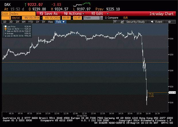 O δείκτης DAX στο γερμανικό χρηματιστήριο αξιών των εισηγμένων εταιρειών σημείωσε απώλειες της τάξης των 6 δισεκατομυρίων ευρώ, λόγω επιφυλακτικότητας των επενδυτών μετά την είδηση ότι ουκρανικές δυνάμεις επιτέθηκαν στη Ρωσική φάλαγγα.