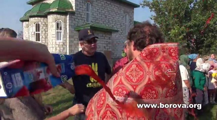 Τα μέλη του εθνικιστικού κόμματος Ελευθερία και του Ριζοσπαστικού κόμματος της Ουκρανίας με επικεφαλής τον αμεφιλεγόμενο Oleg Lyashko, διαπόμπευσαν τον ορθόδοξο ιερέα π. Vladimir της Εκκλησίας του Αγίου Τύχωνα Αγία Σκέπη δικαιοδοσίας του πατριαρχείου Μόσχας κατά την ώρα ακολουθίας σε περιοχή του Κιέβου στην Motovilovka.Οι παραστρατιωτικοί έφεραν διακριτικά των σχηματισμών που ανήκουν και έφτασαν με τζιπ.Απείλησαν τον ιερέα του έδωσαν διορία να φύγει μιά εβδομάδα για τη Μόσχα και του πέταξαν ντοματοχυμό στα άμφια και στο κεφάλι. (RIA Novosti).Οι δράστες του καταμαρτυρούν φιλορωσική στάση και ότι « υποστηρίζει τους τρομοκράτες “.Έγραψαν υβριστικά και απειλητικά συνθήματα αντιρωσικού μίσους στον περίβολο. H ενέργεια αυτή εντάσεται στο γενικότερο πογκρόμ που έχει κηρύξει το Κιέβο στους ανθενωτικούς ορθοδόξους.Επέρχετια μάλιστα μία ημέρα ακριβώς μετά την ανάδειξη του Μητροπολίτη Ονουφρίου στη θέση του επικεφαλή της Ουκρανικής Ορθόδοξης Εκκλησίας της Ουκρανίας δικαιοδοσίας Μόσχας.”Έχουν καταγραφεί περισσότερες από 60 επιθέσεις κατά μελών του ορθόδοξου κλήρου,και ναοί έχουν κατεδαφιστεί.Πολυάριθμες εκκλησίες κάηκαν ή καταστράφηκαν από τα πυρά.Δύο με τρεις ιερείς σκοτώθηκαν” δήλωσε ένας ακτιβιστής των ανθρωπίνων δικαιωμάτων.(rt 16/08/14)