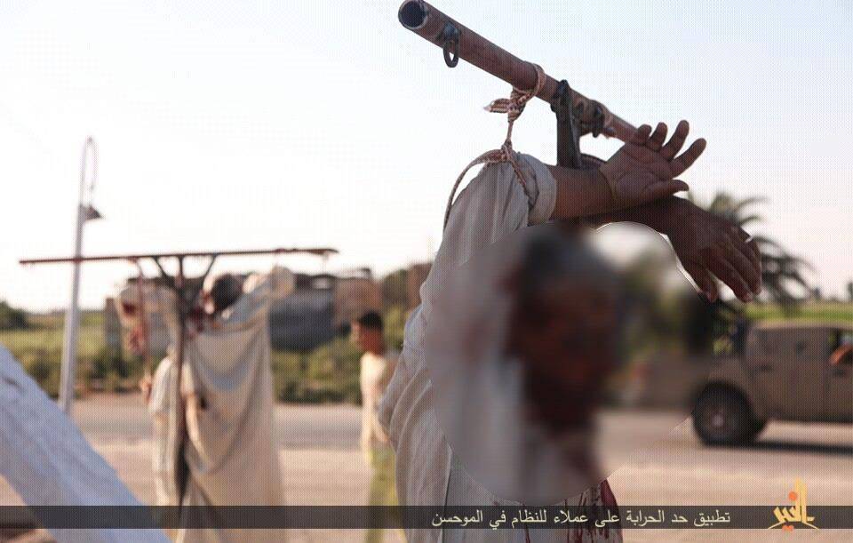 To Iσλαμικό Κράτος προχώρησε και σε νέα δημόσια εκτέλεση 3 πολιτών στην Mohassan της Deir Ezzor.Τους πυροβόλησαν εξ΄επαφής στο κεφάλι.Τα θύματα είχαν μπανταρισμένα τα μάτια. Στη συνέχεια τους σταύρωσαν σε αυτοσχέδια ικριώματα σε κοινή θέα. Σε μια πινακίδια αναρτήθηκε η κατηγορία. Τους αποδίδουν την κατηγορία της αποστασίας.