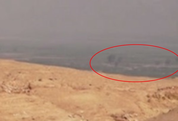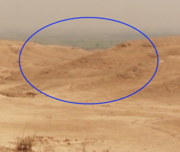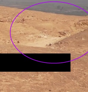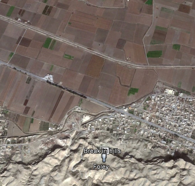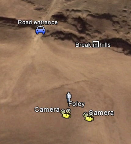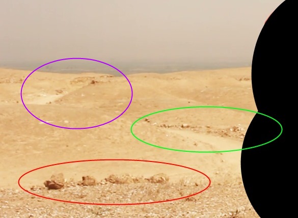 Σε αυτό το πλάνο που γυρίστηκε με τον James Foley κατά πρόσωπο, είναι ορατά δυο ρήγματα του βραχώδους τοπίου, αριστερά (μωβ κύκλος) και δεξιά (μπλε κύκλος).