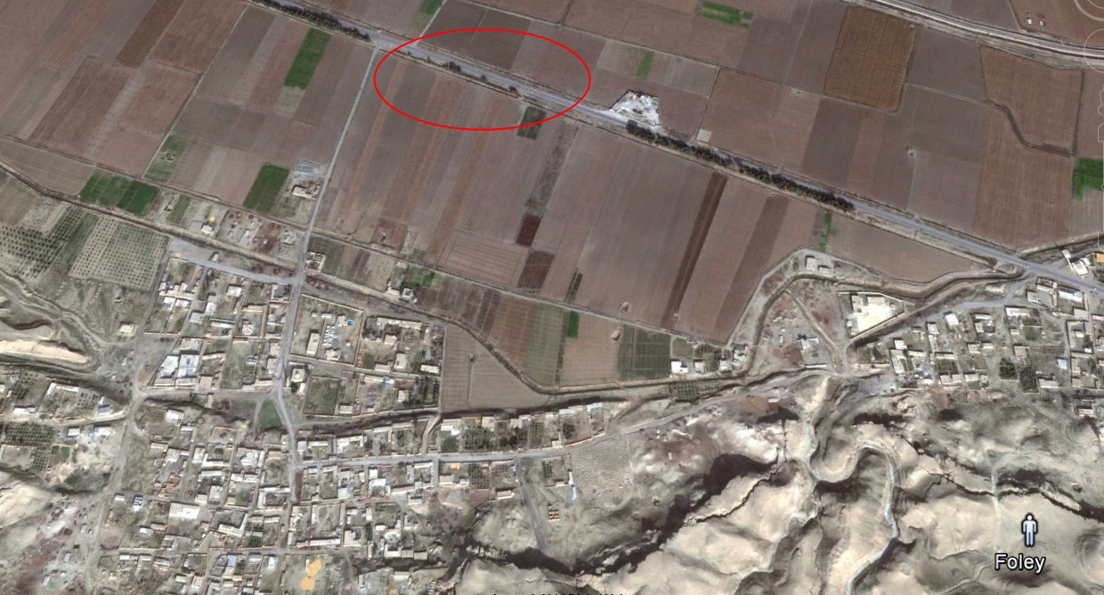 Στην κάτωθι φωτογραφία ο δημοσιογράφος έχει σημειώσει τον χωματόδρομο, το απότομο βραχώδες τοπίο που τον καλύπτει και την τοποθεσία της εκτέλεσης και της βιντεσκόπησης.