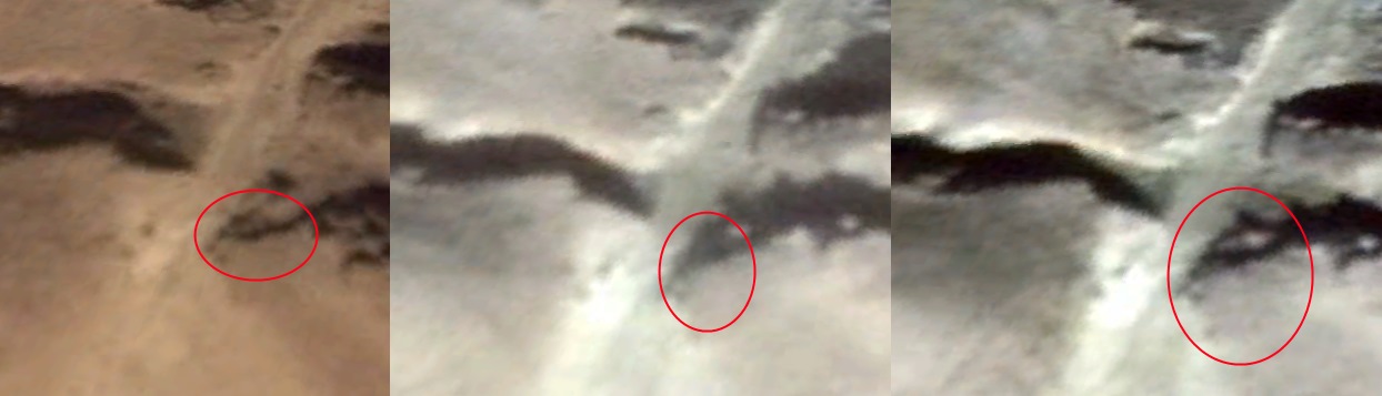 Στις κάτωθι αντίστοιχες δορυφορικές εικόνες διακρίνεται το ρήγμα στο βραχώδες τοπίο όπου υπάρχει ο μικρός χωματόδρομος.