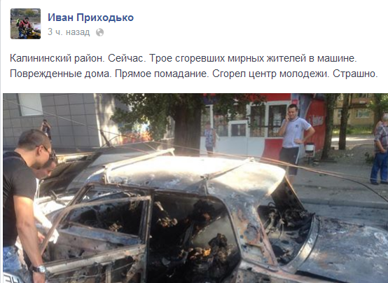 Στο κέντρο του Ντόνετσκ στην περιοχή Kalininsky από τους βομβαρδισμούς ένα αυτοκίνητο κάηκε ολοσχερώς απανθρακώνοντας 3 αμάχους.Τα θύματα είναι φρικτά παραμορφωμένα ,κάρβουνο . Νέα Οδησσός όπου οι νοσταλγοί των Νταχάου έκαψαν 100 και πλέον άτομα ζωντανά στην Εστία των συνδικάτων. Στη σελίδα του στο fb o Αναπληρωτής Πρόεδρος του περιφερειακoύ Συμβουλίου του Ντόνετσκ Ιβάν Prikhodko αναφέρει :