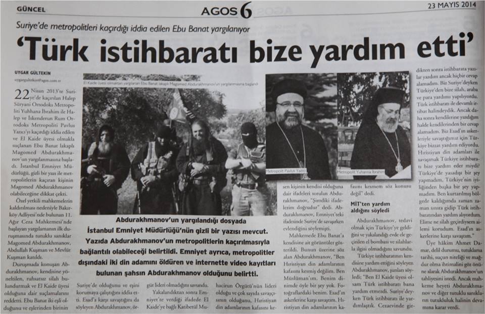 M. Erkan: Ανακάλυψα ότι η οργάνωση που εγώ θεωρούσα ότι είχε απαγάγει τους επισκόπους ήταν αυτή του Ketibetul Muhacirun καθοδηγούμενη από τον Ebu Banat,η οποία είχε ορκιστεί πίστη στην ISIS (νυν Iσλαμικό Κράτος) και στην οργάνωση Ceysul Muhacirun vel Ensar που διηύθυνε ο Ebu Omer Checheni. Αποκάλυψα ότι o Ebu Banat συνελήφθηκε στην Τουρκία για κατοχή όπλων και για το ότι ήταν μέλος της Al-Qaïda.Η νομική διαδικασία για τον Ebu Banat ξεκίνησε.Κατά την διάρκεια των ανακρίσεων ο Ebu Banat είπε επανειλημμένα ότι η ΜΙΤ τον βοήθησε. Εν τω μεταξύ μετά την εμφάνιση στον τύπο των αληθειών που απεκάλυψα το FBI άνοιξε μια έρευνα σχετικά με τον Ebu Banat. Το FBI ζήτησε τους φακέλλους από το δικαστήριο της Τουρκίας αλλά η Τουρκία ακόμη δεν έχει ανταποκριθεί. Τελευταία, εδώ και κάποιους μήνες μια νέα σπέκουλα δημοσιεύθηκε εκ νέου στον λιβανέζικό τύπο. Εδώ και κάποιους μήνες υποτίθεται ότι οι επίσκοποι θα είναι κρατούμενοι κοντά στη Ράκκα και ότι βρίσκονται όμηροι στα χέρια της αποκαλούμενης οργάνωσης bat al-Ansar που εδρεύει στο Λίβανο. Πραγματοποίησα έρευνες σε αυτήν την υπόθεση και κατέληξα στο συμπέρασμα ότι αυτή η οργάνωση δραστηριοποιούνταν τον τελευταίο χρόνο αλλά δεν ήταν και πολύ αποτελεσματική. Η Usbat al-Ansar της Συρίας είναι μια οργάνωση «κλειστό κουτί». Bρήκα δεδομένα για να επιβεβαιώσω αυτήν την πληροφορία.