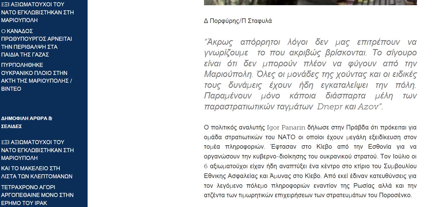 Τον πόλεμο σε όλα τα μέτωπα τον κερδίζουν οι εθελοντές και όχι οι μισθοφόροι. Και να προσέξει να μην εγκλωβιστεί στις πληροφορίες που διαχειρίζεται όπως οι ειδικοί επί των σρατιωτικών πληροφοριών κυβερνο αξιωματούχοι του ΝΑΤΟ στη Μαριούπολη που αφορά την είδηση που έκλεψε για μια ακόμη φορά…