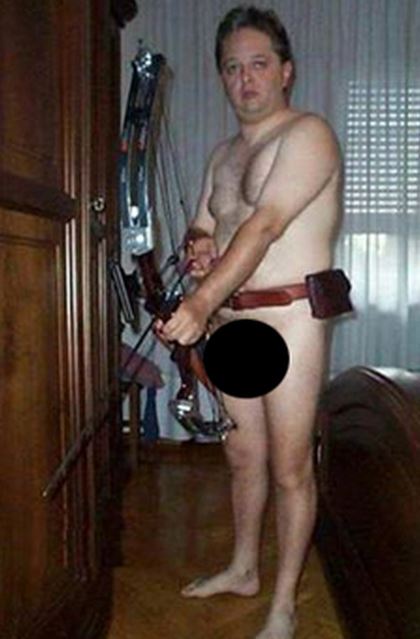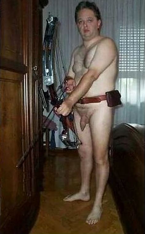 Ποζάρει και φωτογραφίζεται ολόγυμνος στο εσωτερικό διαμερίσματος, κατά πάσα πιθανότητα κρεβατοκάμαρας. Με μια λεπτομέρεια: κρατάει περήφανα μια επαγγελματική βαλλίστρα σαν αυτές με τις οποίες σκότωναν οι ευρωμάινταν.