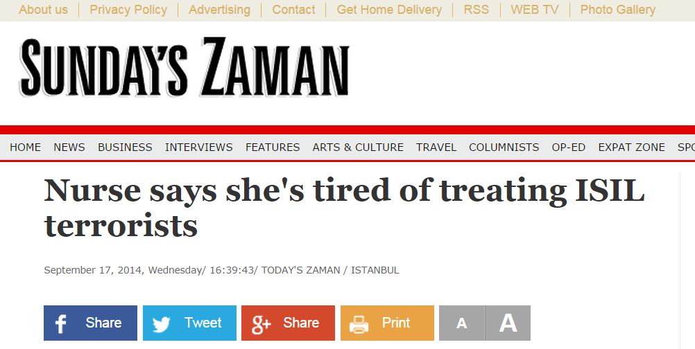 Δημοσίευμα της τουρκικής Τoday’s Zaman στις 17/09/14 επιβεβαιώνει αυτό που είναι κοινός τόπος για όλους τους εχθρούς του Ισλαμικού Κράτους, δηλαδή ότι η Τουρκία εκτός από το να προωθεί μέσα από τα σύνορά της Τζιχαντιστές σε Συρία και Ιράκ, περιθάλπτει και στα παραμεθόρια νοσοκομεία της τους τραυματίες τρομοκράτες.