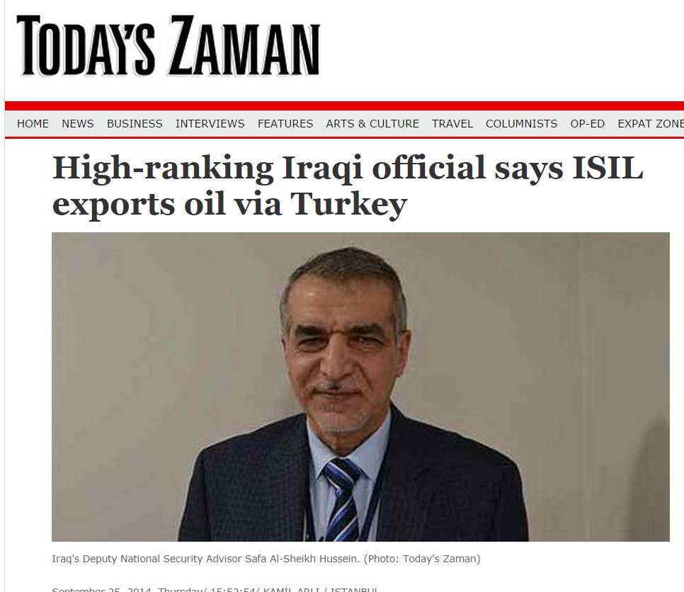 Ο Εθνικός Σύμβουλος Ασφαλείας του Ιράκ και βουλευτής, Safa Al-Sheikh Hussein δήλωσε ότι η Τουρκία είναι η χώρα που “βάζει τα καύσιμα στο όχημα της τρομοκρατικής οργάνωσης Ισλαμικό Κράτος Ιράκ και Μ.Συρίας” , επιτρέποντας στους εξτρεμιστές να εξάγουν πετρέλαιο μέσα από την Τουρκία. Ο ίδιος δήλωσε στην εφημερίδα Today’s Zaman την Τετάρτη: