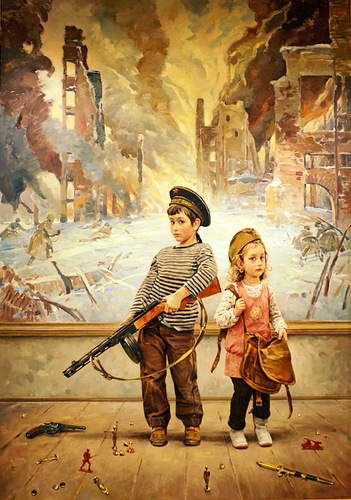 Η έκθεση παρουσιάζει έναν κύκλο εργασιών του ρώσου καλλιτέχνη, αφιερωμένο στα πολεμικά γεγονότα του 1612 που έλαβαν χώρα στην Nijni Novgorod -που ετυμολογικά σημαίνει “Κάτω Νέα Πόλη”- και στον ηρωισμό των ανδρών της πολιτοφυλακής της.
