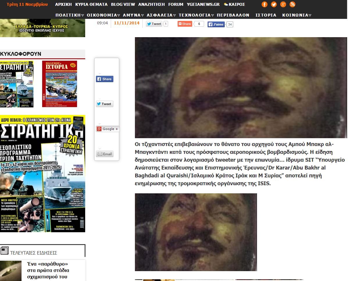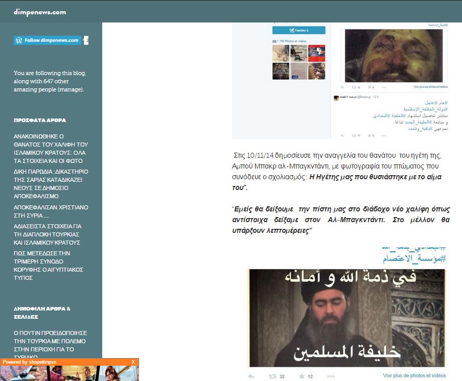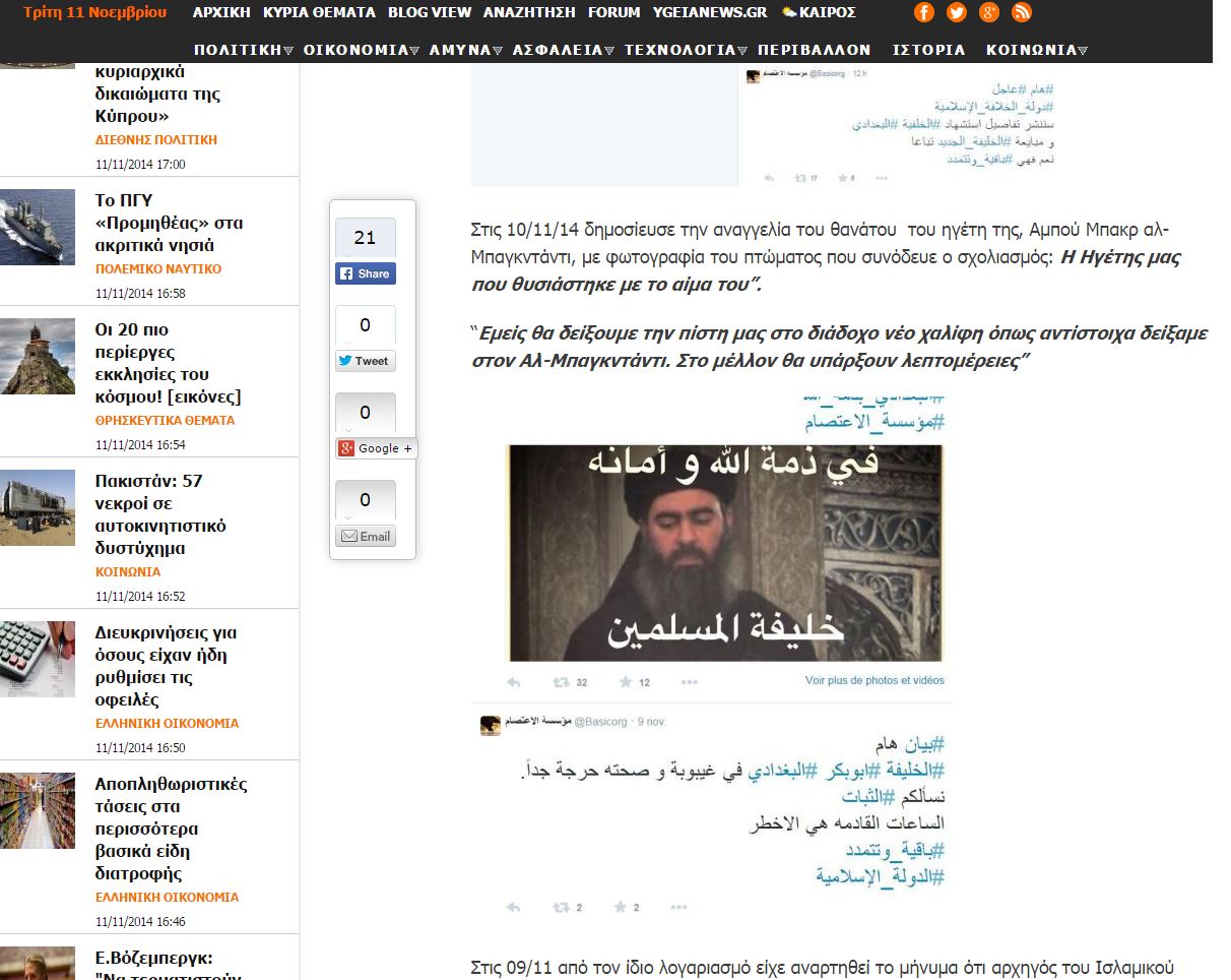Οι άνθρωποί του ψαλίδισαν την φωτό με τα διακριτικά του Site μας και την οικειοποιούνται.Μαζί της οικειοποιούνται και τον κόπο,την εξουθένωση,την έκθεση σε κίνδυνο από την πλοήγηση στα πλέον σκληροπυρηνικά τζιχαντιστικά ιστολόγα και twitter για την πιστοποίηση και το ντοκουμεντάρισμα των στοιχείων.Αναπαράγει δε όλα τα twitter και τις φωτό από την αποκλειστική μας έρευνα καθώς και σχεδόν όλο το άρθρο αυτούσιο.