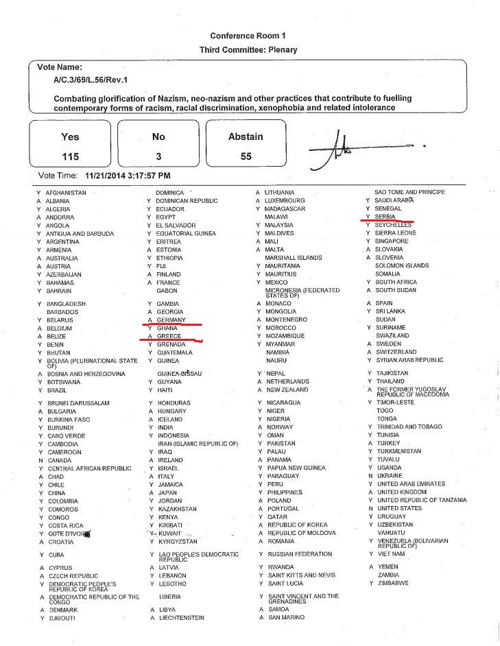 Συνολικά υπέρ ψήφισαν 115 χώρες, ενώ 55 χώρες εκ των οποίων και τα τα κράτη -μέλη της Ε.Ε. προτίμησαν την αποχή, συμπεριλαμβανομένης και της Ελλάδας που ” κόπτεται” για την άνοδο του νεοναζισμού στη χώρα. Βέβαια ακόμα πιο προκλητική και από την Ελλάδα είναι η Γερμανία η οποία αμετανόητη ψήφισε επίσης αποχή! Από όλη την Ευρώπη μόνο η Σερβία ψήφισε υπέρ, σεβόμενη την Ιστορία της.