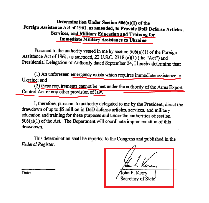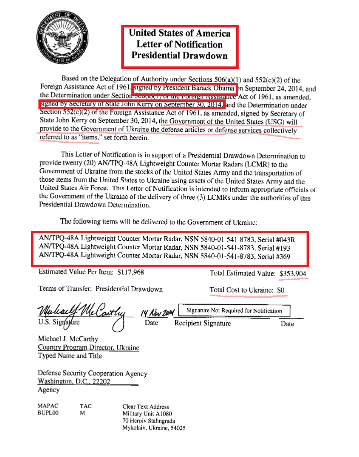 Αυτό το έγγραφο περιέχει τις υπογραφές του Μπαράκ Ομπάμα και του Τζον Κέρι. Οι ΗΠΑ θα παρέχουν στις Ουκρανικές Ένοπλες Δυνάμεις ραντάρ αντι-πυροβολικά. Είναι αυτό στο οποίο αναφέρθηκε με υπερηφάνεια ο κ Poroshenko . Τρία ραντάρ, συνολικής αξίας 353 904 δολλαρίων Από τα αυτά έγγραφα καταλαβαίνουμε ότι η αμερικανική στρατιωτική βοήθεια υπολογίζεται σε εκατομμύρια δολάρια.