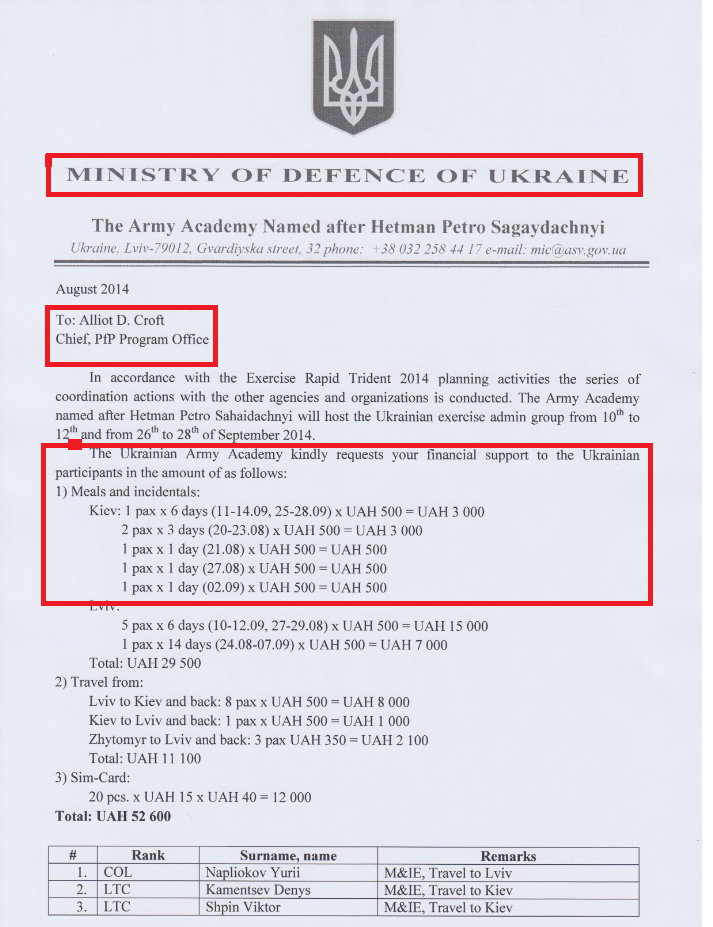 Εδώ είναι ένα άλλο έγγραφο που αφορά στρατιωτικές ασκήσεις. Αυτή τη φορά η Σχολή Ευελπίδων Hetman Petro Sagaydachnyi εκλιπαρεί να καλύψουν τις δαπάνες άσκησης για τα γεύματα και άλλα παρεμφερή για τους έντεκα αξιωματικούς και έναν πολίτη. Ζητούν 52.600 UAH.Γιατί η εκχώρηση επιδόματος των αξιωματικών του Ναυτικού ανέρχεται στις 1310 UAH ημερησίως και το αντίστοιχο επίδομα των αξιωματικών του Πεζικού στις 500 UAH ανά ημέρα;