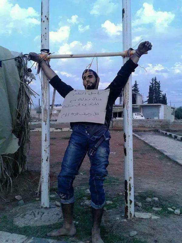 O μαχητής Ahrar Al sham εκτελέστηκε και σταυρώθηκε προς παραδειγματισμό στην Jarabulus επαρχία Χαλεπίου γιατί πολέμησε με τους απίστους όπως αναφέρεται κατά του Ισλαμικού Κράτους.