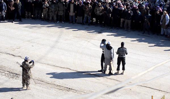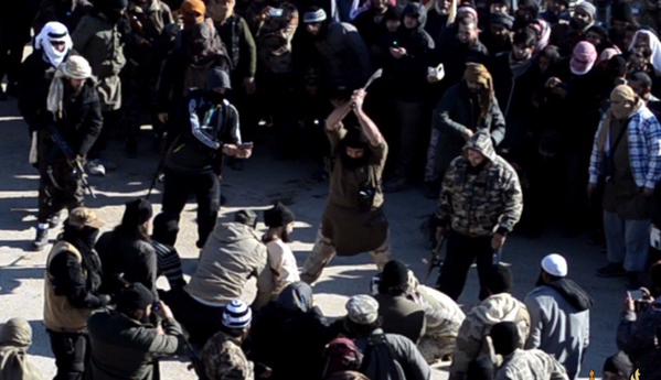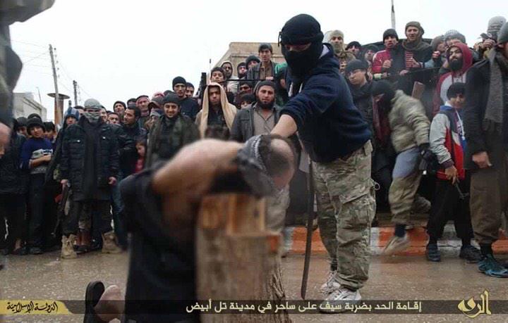 To Iσλαμικό Κράτος αποκεφάλισε σε δημόσια εκτέλεση με την κατηγορία της μαγείας έναν άνδρα στη Συρία.Ο δήμιος είναι κουκουλοφόρος και το θύμα είναι γυμνό από τη μέση και πάνω για να βρει εύκολα το σβέρκο ο εκτελεστής. Χρησιμοποιεί χατζάρα σφαγείου.Ο μελλοθάνατος έχει μπανταρισμένα τα μάτια και πισθάγκωνα δεμένα τα χέρια.Είναι καθηλωμένος στα γόνατα και το κεφάλι του το κόβουν στεγνά σε κούτσουρο.