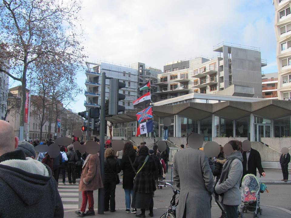 Κρατώντας ένα λάβαρο που στην κορυφή του ανέμιζε η παλαιστινιακή σημαία, από κάτω η αυθεντική σημαία της Συριακής Δημοκρατίας, μετά οι σημαίες της Νεορωσίας των Δημοκρατιών του Donetsk και Lougansk και πιο χαμηλά η γαλλική σημαία της Λορραίνης.