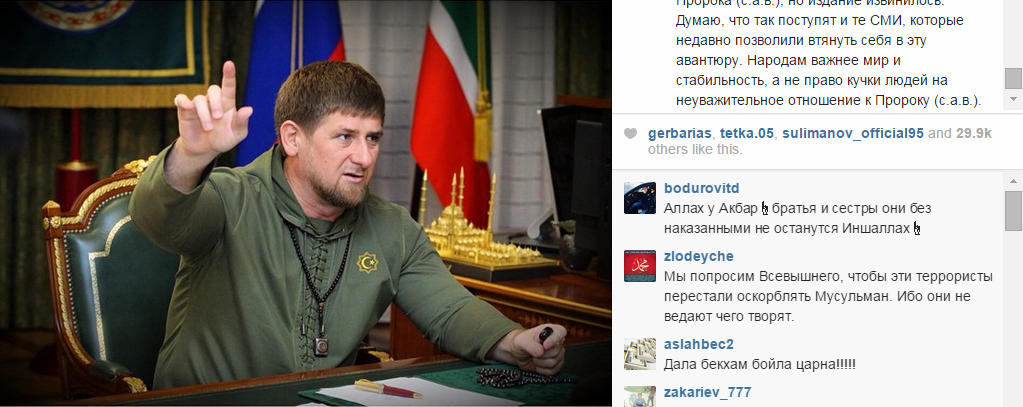 ”Χαιρετίζουμε την ομόφωνη καταδίκη της τρομοκρατίας από τις παγκόσμιες δυνάμεις στο Παρίσι. Αλλά ποιό είδος τρομοκρατίας καταδίκασαν; Την τρομοκρατία σε διεθνές επίπεδο ή μόνο την τρομοκρατία στο Παρίσι; Γιατί οι Πρόεδροι, οι Βασιλείς, οι Πρωθυπουργοί δεν έκαναν ποτέ μια παρόμοια πορεία διαμαρτυρίας κατά των εκατοντάδων χιλιάδων θυμάτων της τρομοκρατίας στη Λιβύη, στην Αίγυπτο, στη Συρία, στην Υεμένη, στο Αφγανιστάν ή στο Ιράκ; Γιατί παρέμειναν σιωπηλοί για τις τρομοκρατικές επιθέσεις στο Γκρόζνι όταν ανατίναξαν ένα κυβερνητικό κτίριο, το στάδιο όπου καθόταν με τους συνεργάτες του ο εκλεγμένος από το λαό Πρόεδρος Hadji Akhmat Kadyrov και σκοτώθηκε επί τόπου; Γιατί δεν έκαναν πορεία για το δράμα στο σχολείο του Beslan , τους ομήρους στο θέατρο της Doubrovka και για τις πρόσφατες επιθέσεις στο Τυπογραφείο και σχολείο στο Γκρόζνι με πάνω από 50 νεκρούς και τραυματίες;”
