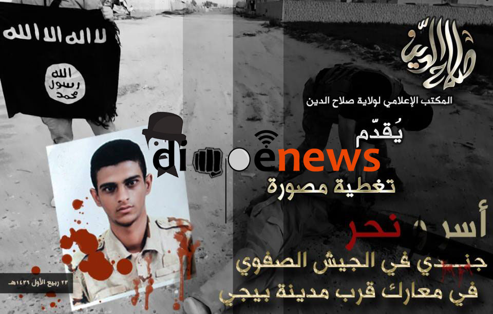 Στο Ιράκ το Ισλαμικό Κράτος αποκεφάλισε στρατιώτη του ιρακινού στρατού.Το γεγονός δημοσιοποιεί το γραφείο Salah al-Din και το αποτρόπαιο έγκλημα γίνεται στο όνομα του Θεού.Κατηγορείται ότι ήταν μέλος του στρατού των σαφαβιδών δηλ. ιρανικών συμφερόντων. O αποκεφαλισμός αυτού του νέου παιδιού έγινε κοντά στην πόλη Baiji στο Βόρειο Ιράκ που βρίσκεται 130 μίλια βόρεια της Βαγδάτης.