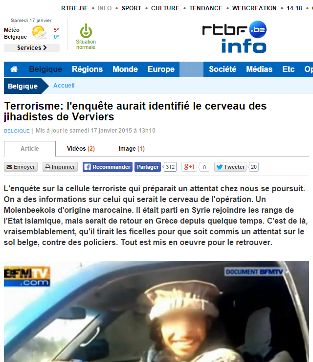 Τώρα το RTBF η κρατική δηλ. Ραδιοτηλεόραση Βελγίου μεταδίδει ότι οι ξένες μυστικές υπηρεσίες έχουν εξαπολύσει ανθρωποκυνηγητό στην Ελλάδα για τον πιο καταζητούμενο και επικίνδυνο τζιχαντιστή στην Ευρώπη.Tαυτοποιήθηκε ο εγκέφαλος των ισλαμιστικών πυρήνων του Verviers που προετοίμαζε επιθέσεις σε αστυνομικά τμήματα και σχεδίαζε να απαγάγει δικαστικό υψηλόβαθμο και να τον αποκεφαλίσει μπροστά την κάμερα.