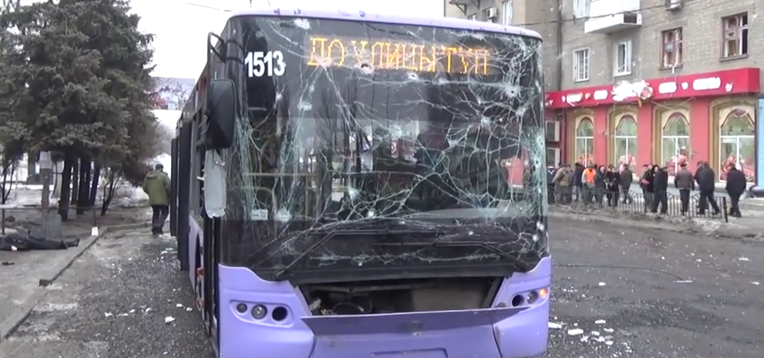 Oβίδα 82 mm εξεράγη σε λεωφορείο και αυτοκίντα κοντά στο κέντρο της πόλης του Ντόνετσκ. Οι στόχοι εντοπίζονται σε μια ακτίνα 25μ.Ο OSCE μελετάει την υπόθεση. Η επίθεση συνολικά κόστισε τη ζωή σε 13 με 15 πολίτες μεταξύ αυτών συγκαταλέγονται και παιδιά. Υπάρχουν 20 σοβαρά τραυματίες.Ο οδηγός ενός αυτοκινήτου κάηκε ζωντανός μέσα στο όχημα.
