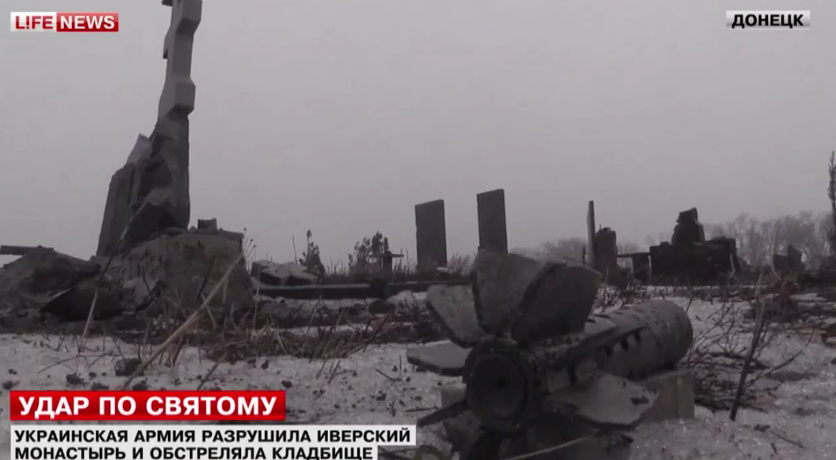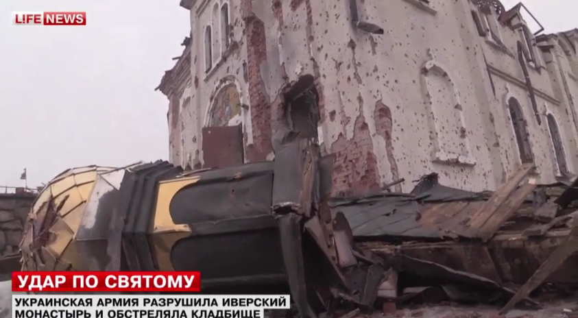 To oυκρανικό πυροβολικό μεταμόρφωσε σε ερείπια το μοναστήρι της Παναγίας των Ιβήρων που βρίσκεται σε μια ακτίνα 500μ από το αεροδρόμιο του Ντόνετσκ.Το ιστορικό και αρχιτεκτονικό αυτό μνημείο είναι διάτρητο από τα πυρά του μίσους των ουκρανών.Βεβήλωσαν ως και το παρακείμενο κοιμητήριο όπου έχουν ταφεί κάτοικοι της πόλης. Έσπασαν σταυρούς ,ξέθαψαν τους νεκρούς.Αυτό είναι το αποτέλεσμα των πολύμηνων καταιγιστικών βομβαρδισμών. Φαίνεται ότι το αεροδρόμιο όχι μόνο είχε άγιο αλλά μάλιστα την Παναγία και ποιά αυτή των Ιβήρων.