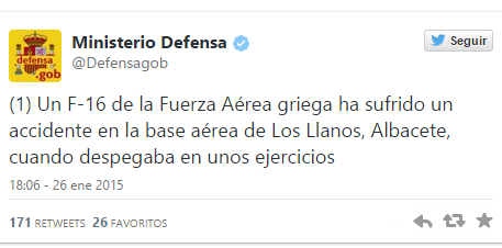 Το προσωπικό αυτό σκοτώθηκε όταν κατέπεσε ελληνικό μαχητικό F-16 σήμερα το απόγευμα στην αεροπορική βάση του Los Llanos στην Ισπανία.