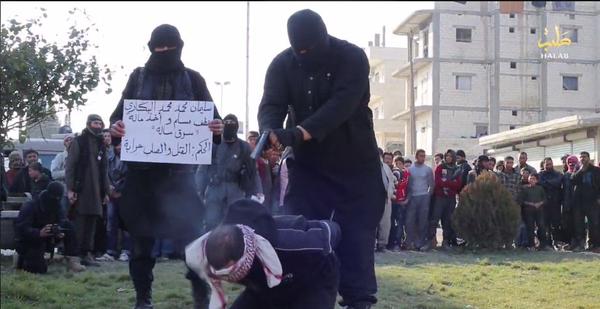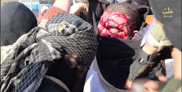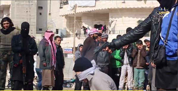 Η ίδια οργάνωση εκτέλεσε δια πυροβολισμών και στη συνέχεια σταύρωσε προς παραδειγματισμό 4 άτομα στο Χαλέπι με την κατηγορία της κλοπής.Η εκτέλεση είναι δημόσια και γίνεται με την παρουσία και παιδιών.ac62ab5a5c08afba762b6c81271496bf_XLΠίσω από τα θύματα κάποιος κρατάει ένα χαρτόνι που αναγράφεται η κατηγορία. Ο δήμιος είναι μασκοφόρος και το θύμα έχει μπαναταρισμένα τα μάτια.B9Q7aUsIQAAYVw7Ο εκτελεστής του ρίχνει εν ψυχρώ με το πιστόλι πισώπλατα στο κεφάλι. Η ίδια σκηνή θα επαναληφθεί και με τους υπολοίπους.ΠΑΤΗΣΤΕ ΕΔΩ ΓΙΑ ΝΑ ΔΕΙΤΕ ΤΟ ΒΙΝΤΕΟ ΣΚΛΗΡΕΣ ΕΙΚΟΝΕΣ ΠΡΟΣΟΣΧΗ +18http://www.liveleak.com/ll_embed?f=0a188fad8858B9Q7aUZIUAAsvNB