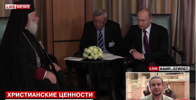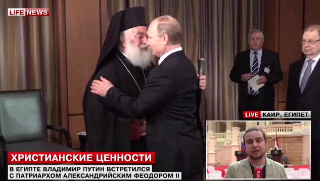 Ο Πούτιν συζήτησε μαζί του σχέδια συνεργασίας του πατριαρχείου με τις ρωσικές ορθόδοξες εκκλησίες της Αιγύπτου στη μάχη για την υπεράσπιση των κοινών ηθικών αξιών.Ο ρώσος πρόεδρος τόνισε ότι όπως στην Αίγυπτο έτσι και στην Ρωσία συνυπάρχουν ειρηνικά εκπρόσωποι διαφορετικών θρησκειών.