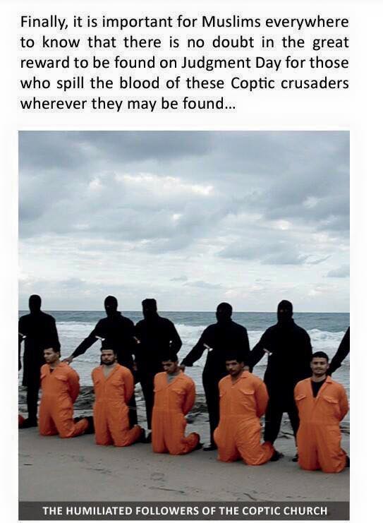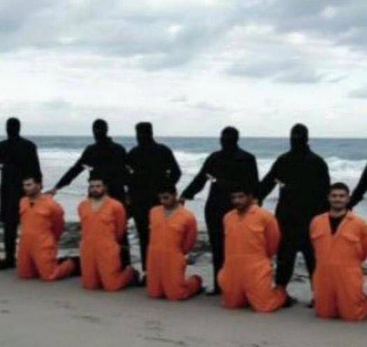Την Πέμπτη η οργάνωση Daesh δημοσιοποίησε φωτογραφίες όπου εμφανίζονται οι αιγύπτιοι απαχθέντες εργάτες στη Λιβύη και που η οργάνωση απειλούσε να τους σκοτώσει. Οι εικόνες τους δείχνουν να φέρουν πορτοκαλί στολή στα πρότυπα του Γκουαντάναμο και με τα χέρια πισθάγκωνα δεμένα καθώς οδηγούνται από το εκτελεστικό απόσπασμα των δημίων τους στην ακτή της θάλασσας.Στη συνέχεια τους σφαγιάζουν.Oι δήμιοι είναι μασκοφόροι και ντυμένοι στα μαύρα.Οι αναρτήσεις τους μιλούν για “ταπείνωση αυτών που ακολουθούν την κοπτική εκκλησία και εκδίκηση για τους διωγμούς των μουσουλμάνων από τους κόπτες σταυροφόρους της Αιγύπτου.