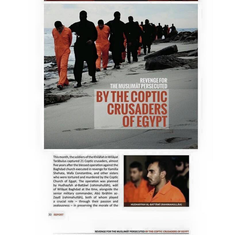 Αυτόν τον μήνα οι στρατιώτες της Κhilafah στην Wilayat Tabulus αιχμαλώτισαν 21 κόπτες σταυροφόρους σχεδόν 5 χρόνια μετά την επιχείρηση κατά της εκκλησίας στην Βαγδάτη ως εκδίκηση για Kamilia Shehata Wafa Constantine και άλλες αδερφές που βασανίστηκαν και σκοτώθηκαν από την κοπτική εκκλησία της Αιγύπτου.Η επιχείρηση σχεδιαάστηκε από τον Ηudhayfah al Battawi …….”