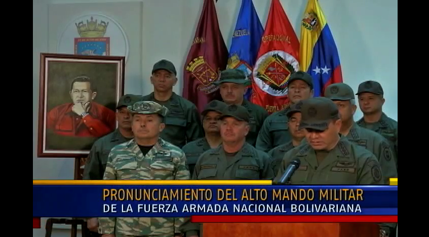“Οι Εθνικές ένοπλες δυνάμεις επαναναδιαβεβαίωνουν την υποστήριξή τους και την πίστη τους στον πρόεδρο Nicolas Maduro και την δέσμευσή τους , στη θέληση του λαού,για την οικοδόμηση του σοσιαλισμού… ” δήλωσε ο ο Υπ. Άμυνας Vladimir Padrino López.