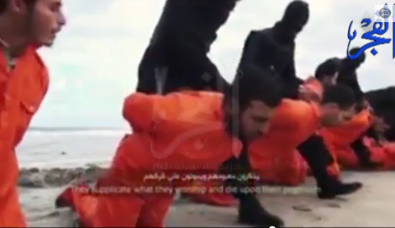 Οι 21 χριστιανοί κόπτες που σφαγιάζονται στη Λιβύη από τους ισλαμιστές φέρουν πορτοκαλί φόρμες και περπατούν μαζί με τους δημίους τους κατά μήκος της ακτής.Με συγχρονισμένες κινήσεις το εκτελεστικό απόσπασμα των δημίων τους καθηλώνει.Οι δήμιοι φέρουν μαύρες στολές είναι μασκοφόροι.