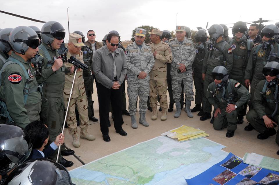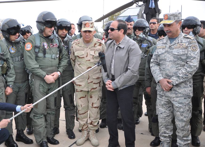 O πρόεδρος Abdel Fattah Sisi σε μια κίνηση με βαθύ συμβολισμό επιεκέφθηκε το πρωί αεροπορική βάση συνοδευόμενος από τον Sedky Sobhy Αρχηγό των Ενόπλων Δυνάμεων και Υπουργό Άμυνας.Συναντήθηκε με τα πληρώματα που επιχειρούν για να την διασφάλιση των δυτικών συνόρων της χώρας. Συζήτησε με τους πιλότους που επειχειρούν για την διασφάλιση των συνόρων από ανεπιθύμητες εισροές και κατά των ισλαμιστικών οργανώσεων.