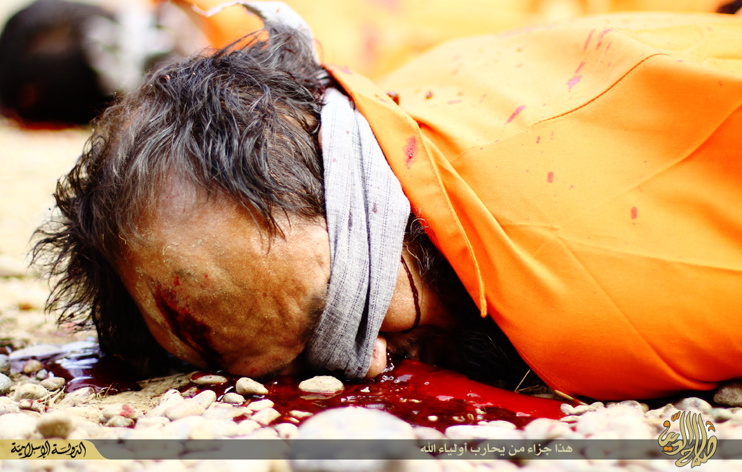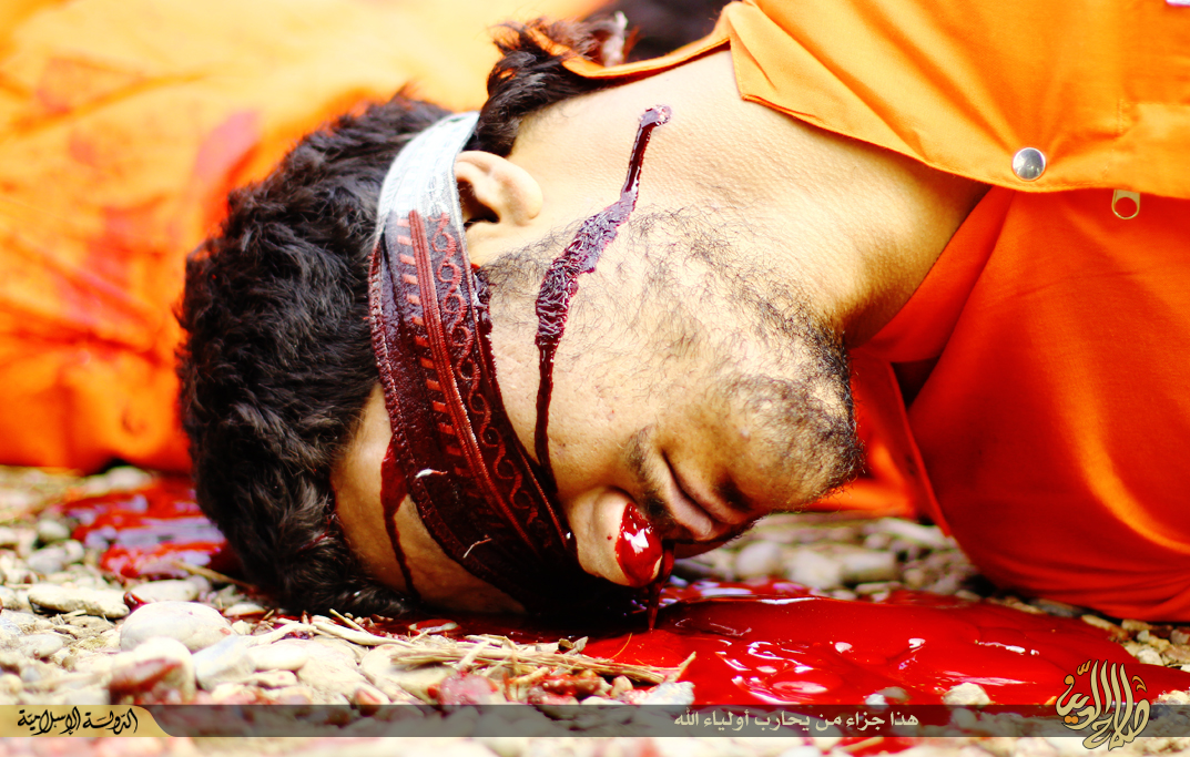 Ένα τετραμελές εκτελεστικό απόσπασμα του Ισλαμικού Κράτους εκτελεί στην ύπαιθρο 4 άνδρες με την κατηγορία της κατασκοπίας.Τα θύματα οδηγούνται με δεμένα τα χέρια στον τόπο θυσίας.Φέρουν πορτοκαλί φόρμες στα πρότυπα του Γκουαντάναμο.