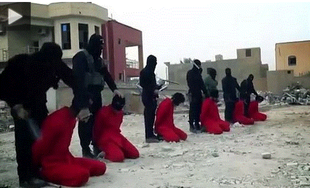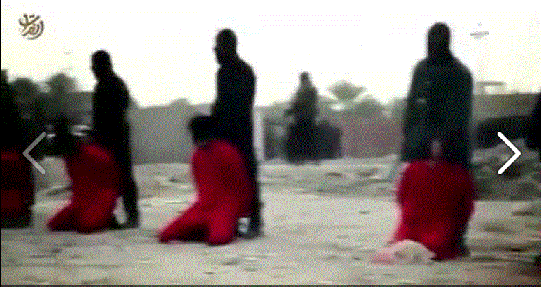 Νέο βίντεο που δημοσιοποίησε το Ισλαμικό Κράτος εμφανίζει τον ομαδικό αποκεφαλισμό 8 ισρακινών και σύριων στρατιωτών για αντίποινα.Οι 8 μελλοθάνατοι οδηγούνται από μασκοφόρους που φέρουν χασαπομάχαιρα στα χέρια στον τόπο εκτέλεσης.Το τελετουργικό είναι πανομοιότυπο.