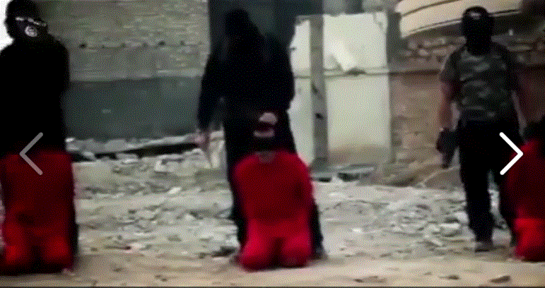 Κάθε δήμιος μεταφέρει και ένα θύμα.Τα θύματα είναι ντυμένα με πορτοκαλί φόρμες που παραπέμπουν στο Γκουαντάναμο.Οι μακελάρηδες δικαιολογούνν την πράξη τους ως αντίποινα για τις στρατιωτικές επιχειρήσεις σε Συρία και Ιράκ.Οι μελλοθάνατοι έχουν μπανταρισμένα τα μάτια.Κατηγορήθηκαν ότι ήταν πληροφοριοδότες και μετείχαν σεπολεμικές επιχειρήσεις κατά της ISIS.