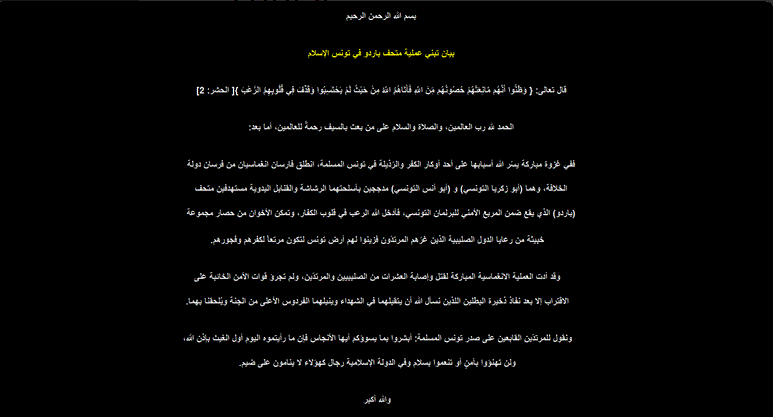 Το SITE της οργάνωσης μετέφερε ότι η οργάνωση διέδωσε ένα ηχητικό μήνυμα με την αναάληψη ευθύνης γι αυτήν την επίθεση που είναι η πιο σοβαρή έπειτα από την επίθεση αυτοκτονίας που εκδηλώθηκε το 2002 κατά συναγωγής στην Djerba και είχε στοιχίσει τη ζωή σε 14 γερμανούς ,2 γάλλους και 5 τυνήσιους.Την επίθεση τότε την είχε διεκδικήσει Al-Qaïda.Η οργάνωση διευκρινίζει ότι τα 2 μέλη της που πραγματοποίησαν την επίθεση ήταν Τυνήσιοι και ότι επιλέχτηκε το Μουσείο που γειτνιάζει με το Κοινοβούλιο στην πιο ασφαλή περιοχή της χώρας για να κάνει επίδειξη δύναμης και να αποδείξει την ισχύ της.