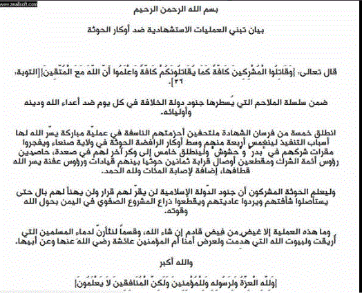 Οι νέες αυτές σημερινές επιθέσεις την Παρασκευή διεκδικήθηκαν από την Daesh δηλ. το Ισλαμικό Κράτος. Ο επιχειρησιακός τους τρόπος ωστόσο παραπέμπει στην Al-Qaida που δρα στην αραβική χερσόνησο (Aqpa) αντίπαλος των Houthis.