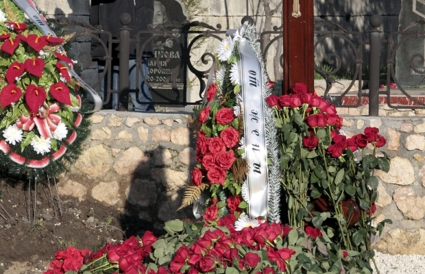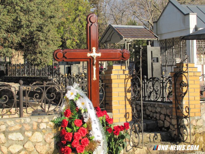 Πολλά στεφάνια στον τάφο με αφιερώσεις στον “αγαπημένο γιό από τους γονείς τους”, “Από τη γυναίκα του”, “από τους συναδέλφους τους,” “Από την οικογένεια Dyachenko.”