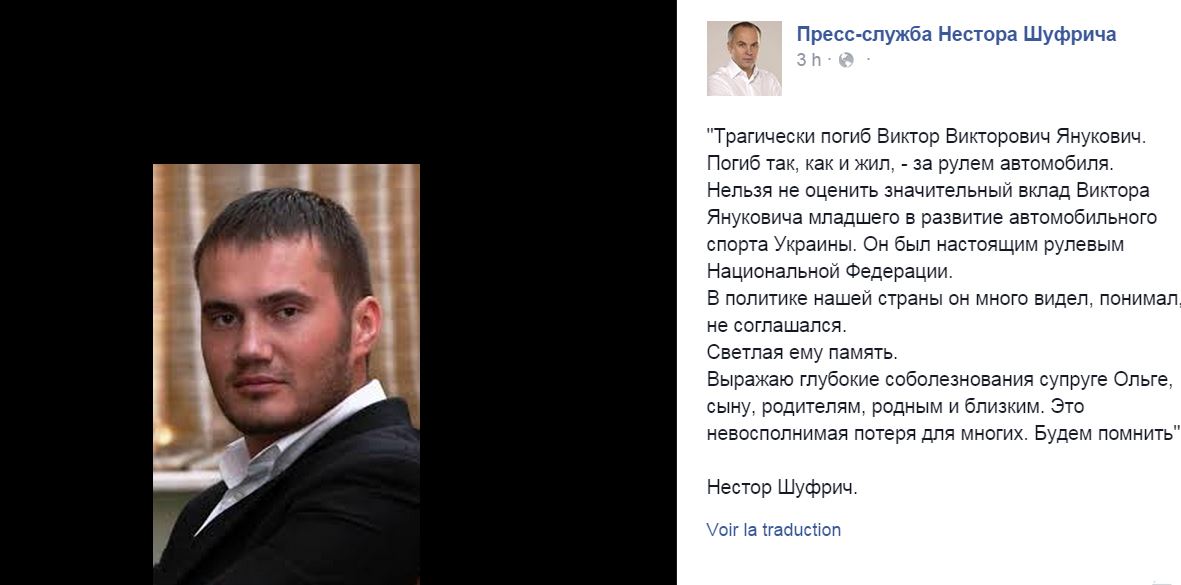 Τραγικό θάνατο βρήκε ο 33χρονος γιός του τ.Προέδρου της Ουκρανίας, Βίκτορ Γιανουκόβιτς ο νεότερος. ”Πέθανε όπως έζησε – στο τιμόνι. “έγραψε στη σελίδα fb ο εκπρόσωπος Τύπου του κόμματος των Περιφερειών που ηγούνταν ο πατέρας Γιανούκοβιτς χωρίς να αποκαλύψει τις συνθήκες και τον τόπο του θανάτου του.
