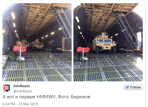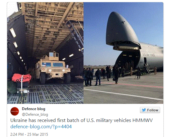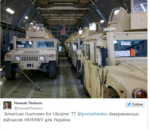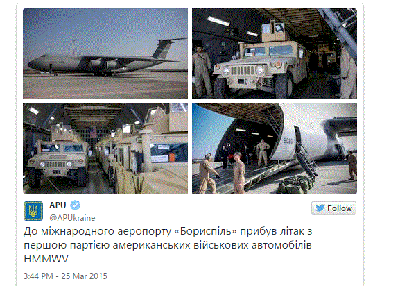 ΤΑ HMMWVs (Humvees) αν και δεν θεωρούνται θανατηφόρα παρά ταύτα στο εσωτερικό έχουν πυροβόλα.Η παράδοσή τους είναι υλοποίηση συμφωνίας της Ουκρανίας με την Washington. Ο συνταγματάρχης Andrey Lysenko των ουκρανικών δυνάμεων δήλωσε ότι περιμένουν άλλα 230 Humvees να φθάσουν στο Κιέβο ως ενισχύσεις από την Washington. Το Κιέβο αγόρασε πρόσφατα βρετανικά τεθωρακισμένα οχήματα  Saxon έναντι του ποσού $50,000 έκαστο.(RT 25/3/15)CaΘΙΥΓΓΘΙΑΣΓΘΗΘΟ
